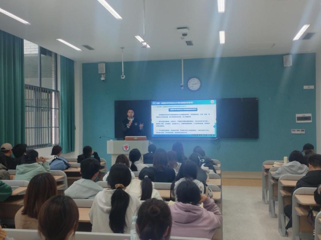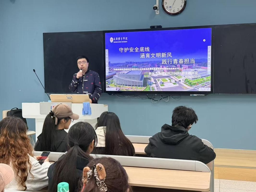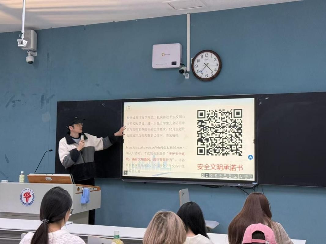 班会围绕安全教育、文明养成和日常管理三大重点展开。在安全教育方面,各班开展宿舍用电、校园禁烟等警示教育,筑牢安全防线;文明养成环节着重引导电动车规范使用与公共场所文明行为;日常管理方面强化夜间归寝、按时就寝、课堂手机使用等制度执行。班会还通报了10月份违规违纪及考勤情况,通过具体案例分析强化教育效果。各班组织学习了《成都体育学院安全文明校园建设承诺书》,并在班长带领下集体签署,引导学生自觉遵守校纪校规。